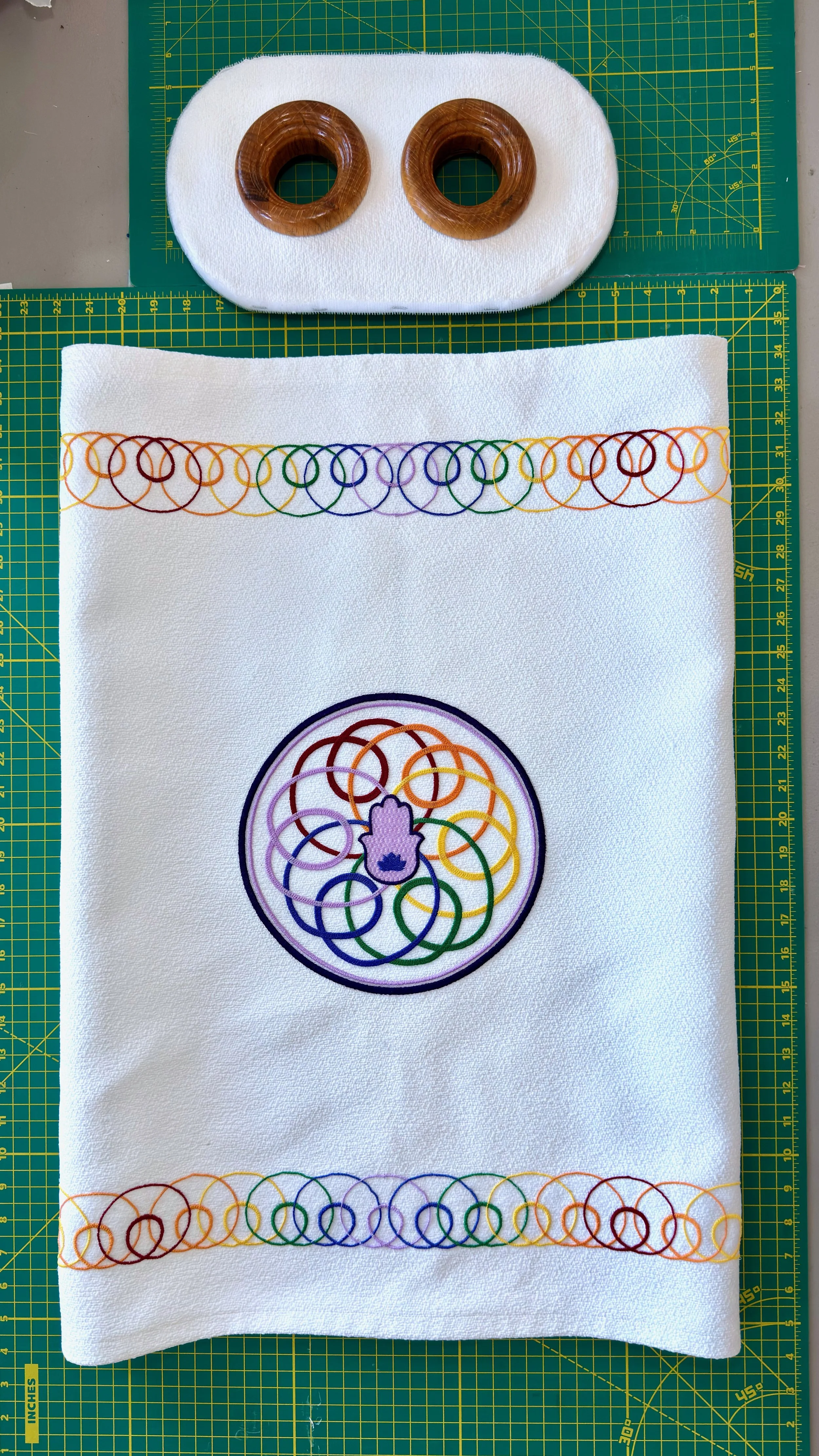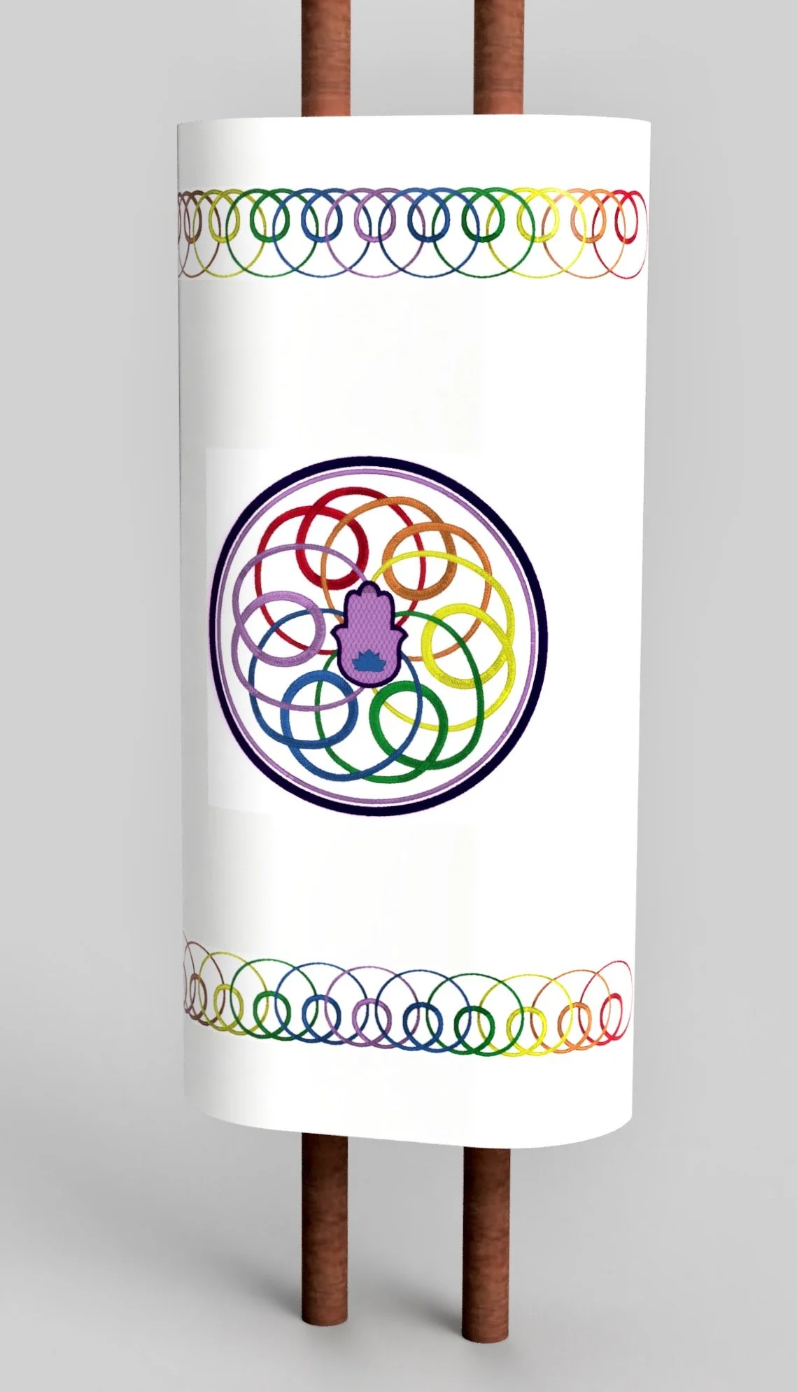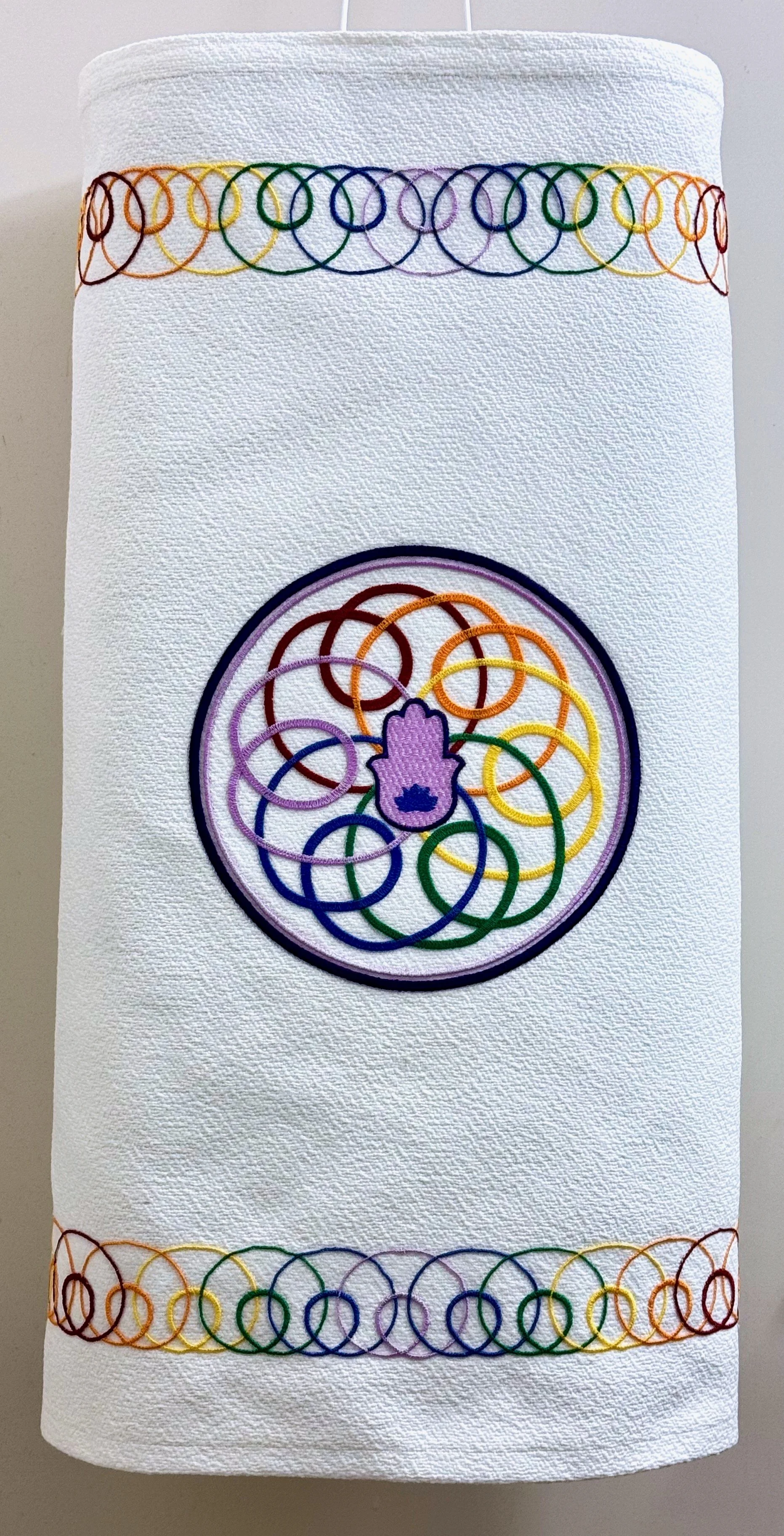 “It bears our HaNefesh logo: the hamsa and lotus, symbols of protection, resilience, and rootedness. It holds the rainbow colors, proclaiming that all people, all identities, belong here. It carries intertwined circles, reminding us that our lives are woven together—none of us is whole without the other. And most powerfully, it bears the names of every person who helped create it—our community literally inscribed in Torah.”